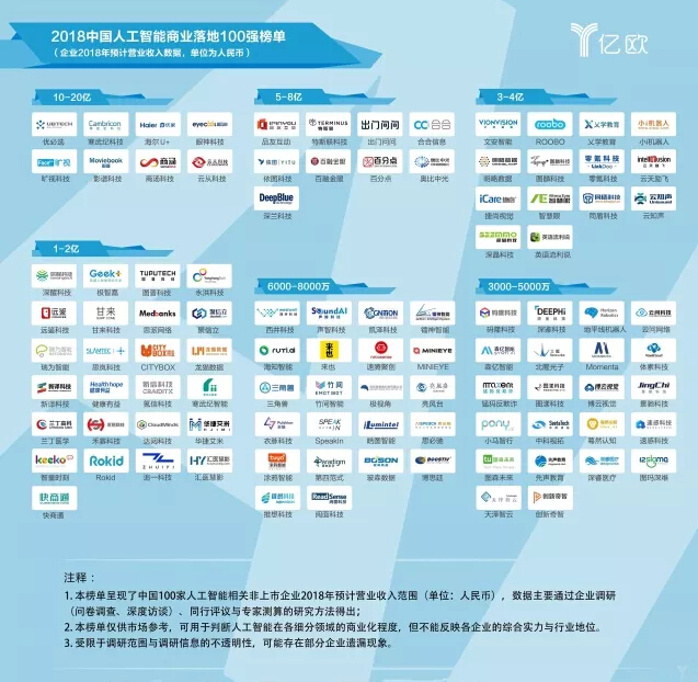 据悉,此次评选是亿欧公司旗下的研究咨询机构——亿欧智库的分析师团队,耗时数月完成了全国200家人工智能企业、22家知名投资机构的走访和调研,详细了解了各企业的产品/服务、行业布局、商业模式、营收状况、标杆客户等具有重要参考价值的信息,并完成了“2018中国人工智能商业落地100强榜单”的梳理。